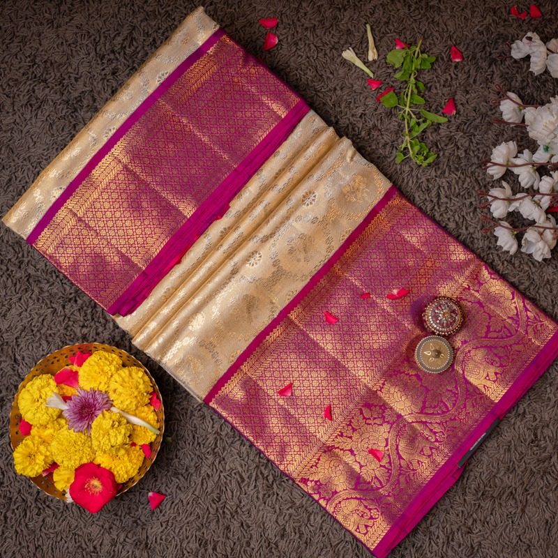 “Pure Kanchivaram Splendor: Embellished with 2 gm Zari, this saree narrates a regal tale of elegance, where Pure Kanchivaram threads weave a timeless masterpiece for your grand moments.”