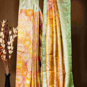 “This exquisite Banarasi silk saree features a luxurious golden-green body with intricate zari weaving and a contrasting pink floral brocade pallu for timeless elegance.”