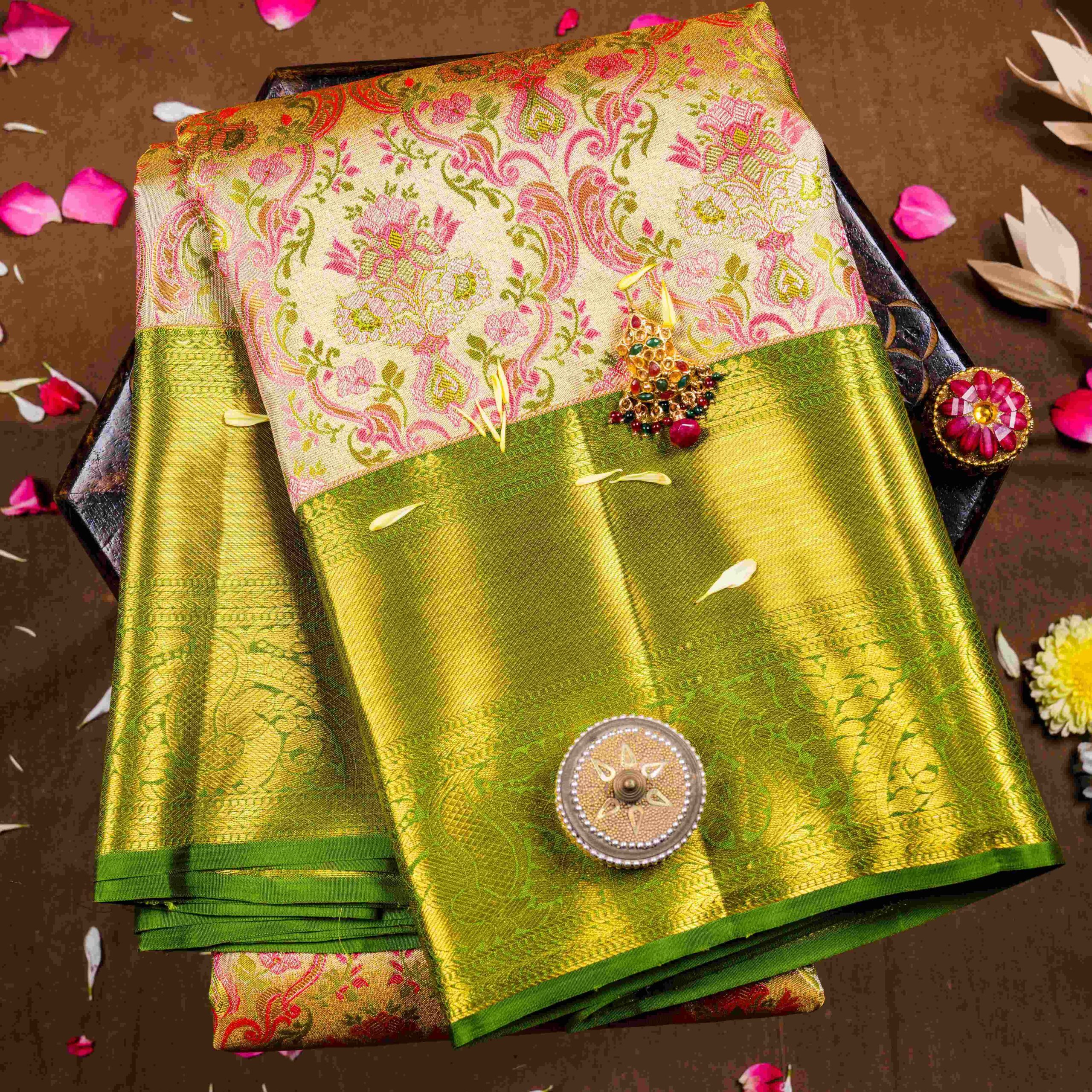 “Elegant Kanchipuram silk saree in vibrant green and pink with intricate pure zari woven floral patterns, a rich gold zari border, and a matching unstitched silk blouse—perfect for festive occasions.”