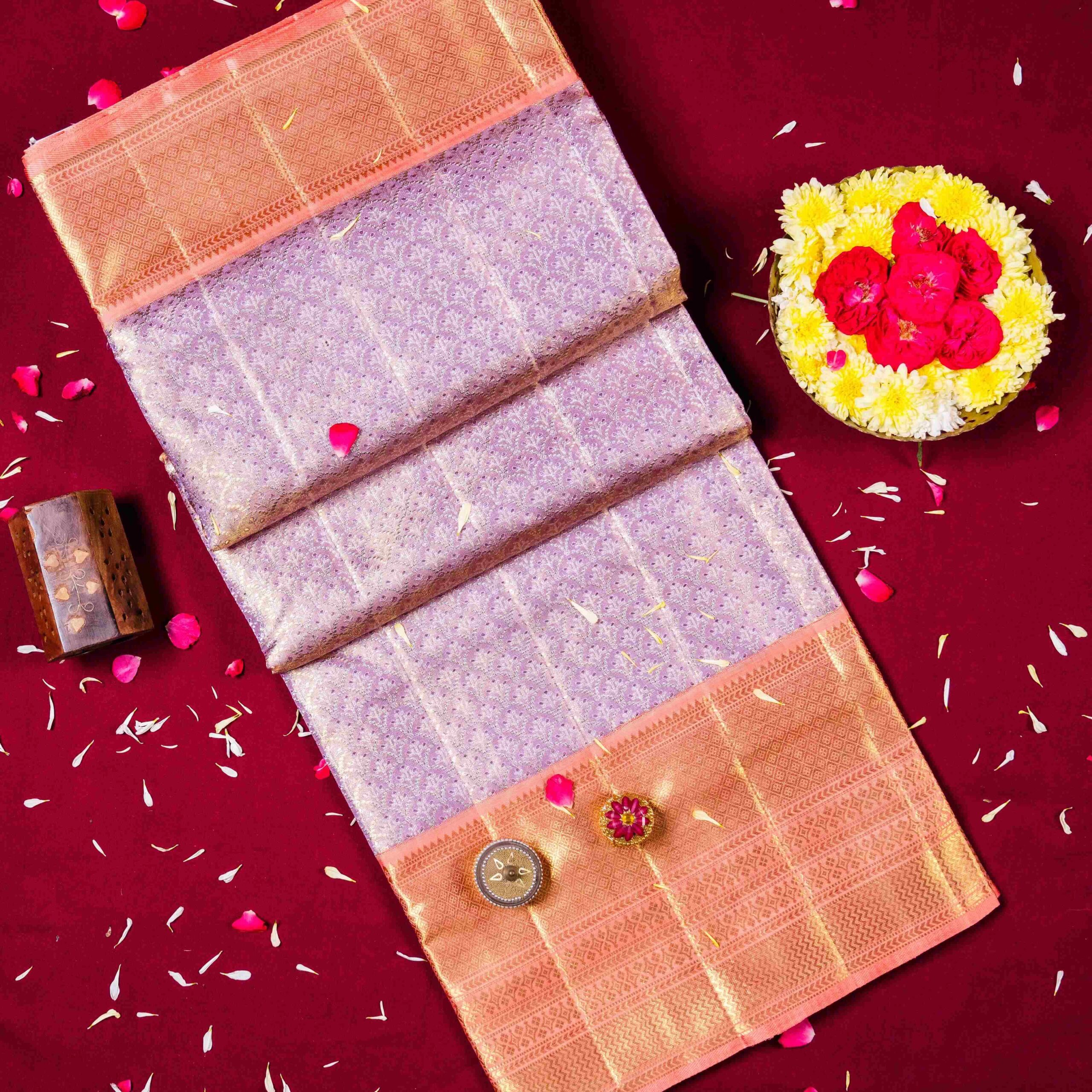 “This exquisite lavender Kanjivaram silk saree features intricate golden zari work with a contrasting peach border, perfect for festive occasions and grand celebrations.”