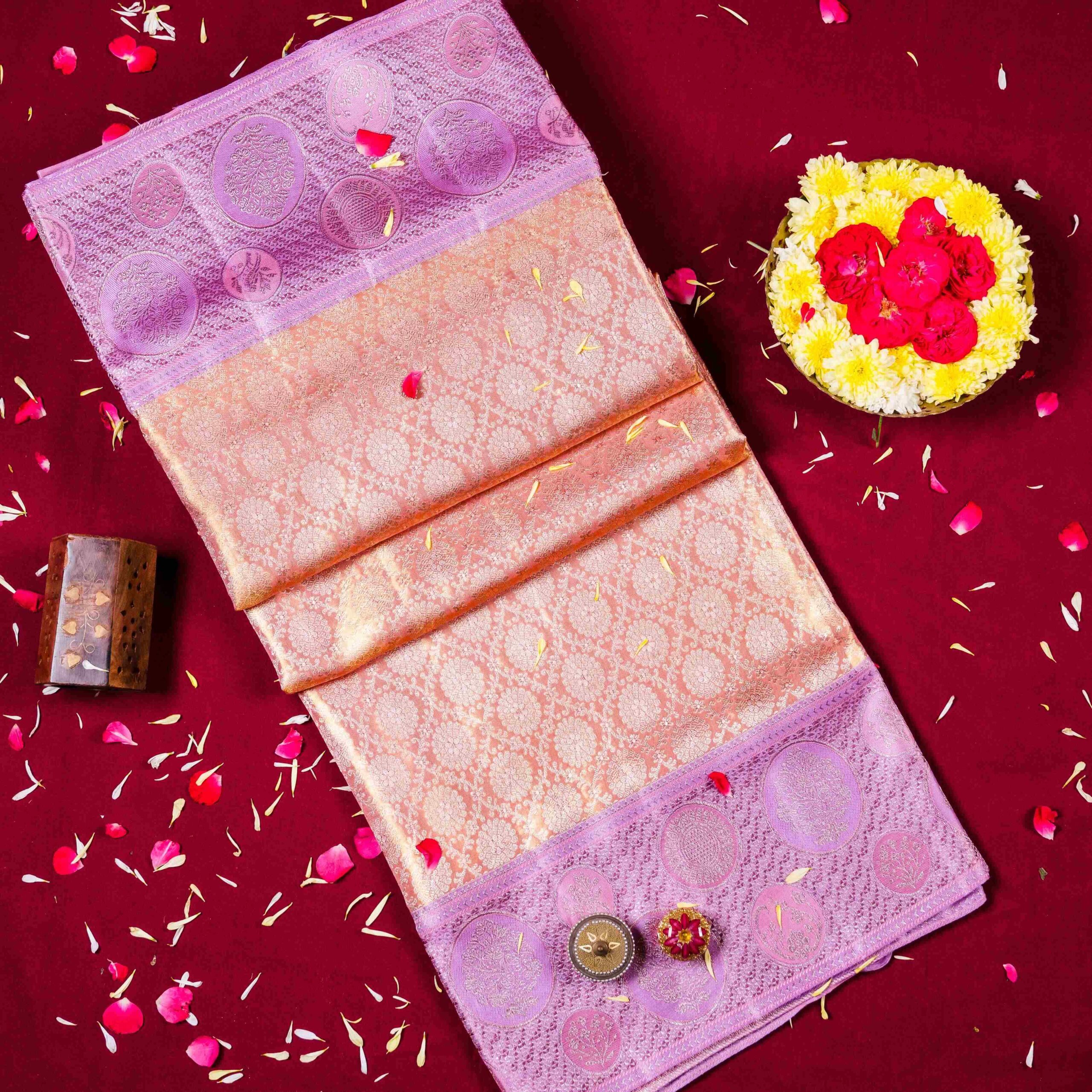 “Elegant Banarasi silk saree in soft pink and gold with intricate zari woven circular motifs, a lavender and gold border, and a matching unstitched blouse, perfect for special occasions and celebrations.”