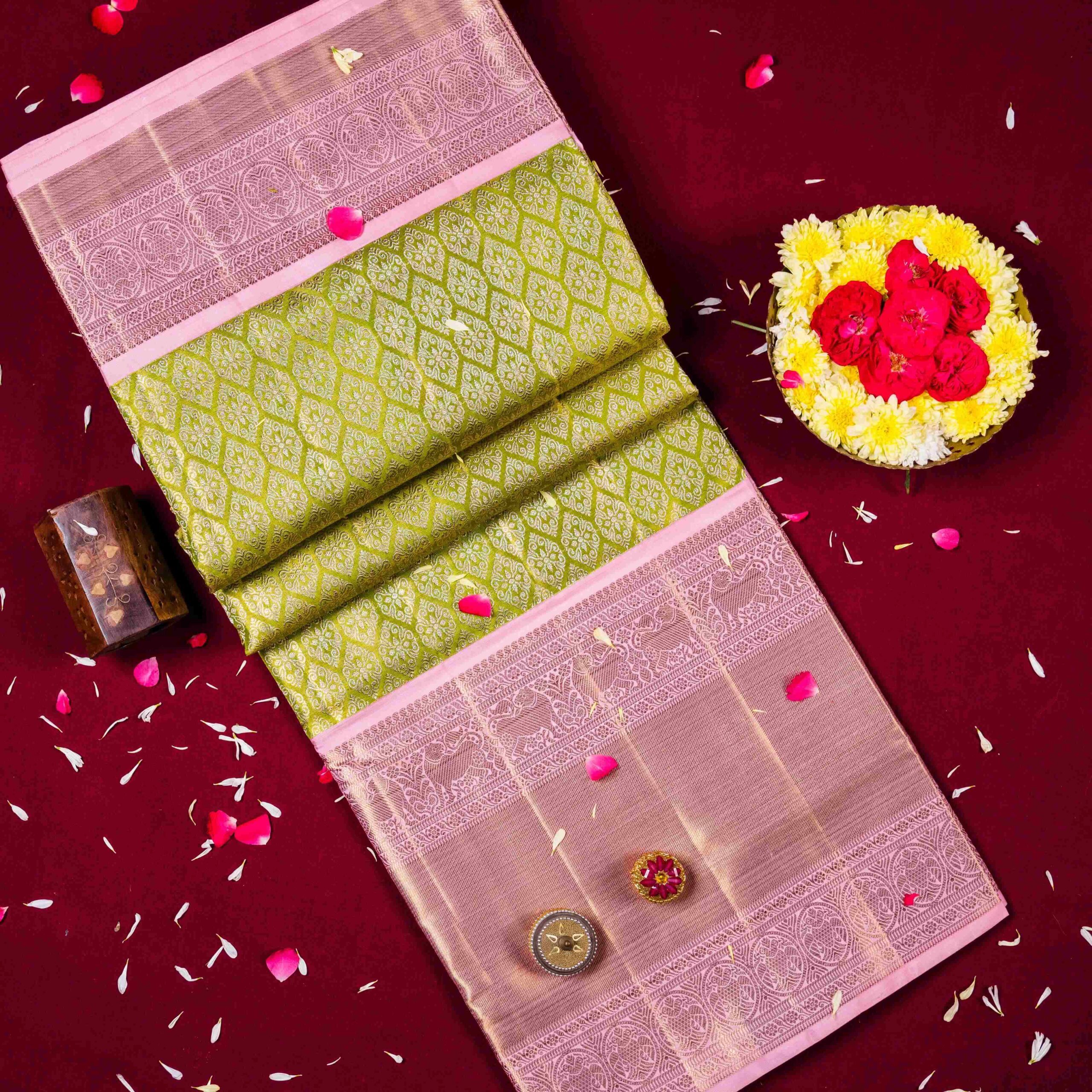 “This classic Banarasi silk saree showcases a detailed gold brocade pattern on a green base, accentuated by a soft pink border with traditional designs.”