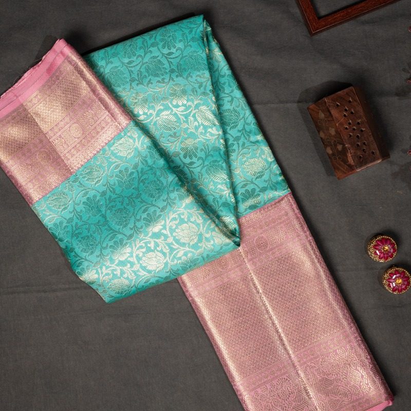 Sea Green Serenity with Baby Pink Bliss: Grace yourself in the enchanting combination of Kanchipuram Saree, harmonizing Sea Green and Baby Pink hues. An ethereal ensemble for a timeless and refined presence.