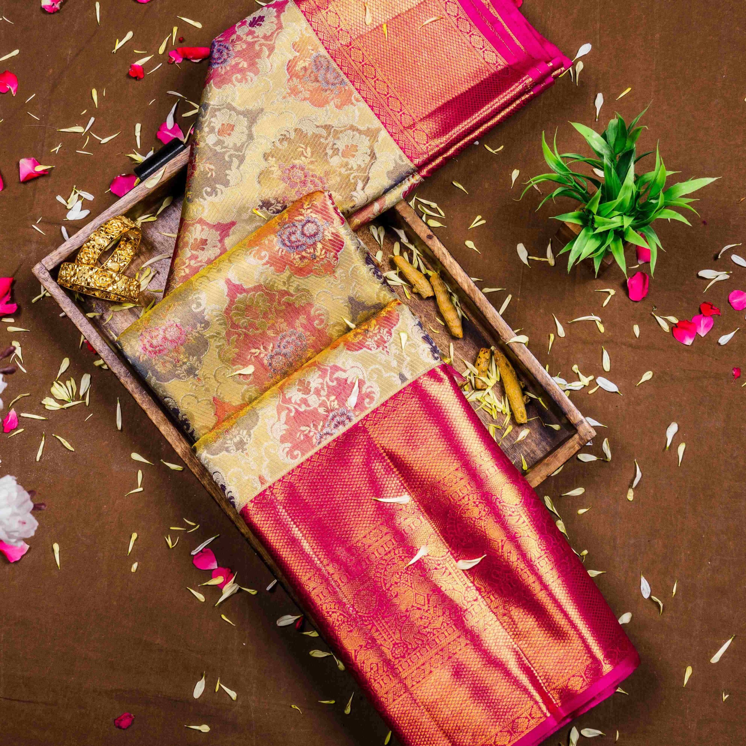 “This exquisite Kanchipuram silk saree features intricate zari weaving with floral and paisley motifs. The rich gold and red combination, complemented by a luxurious woven pallu, makes it perfect for grand occasions.”