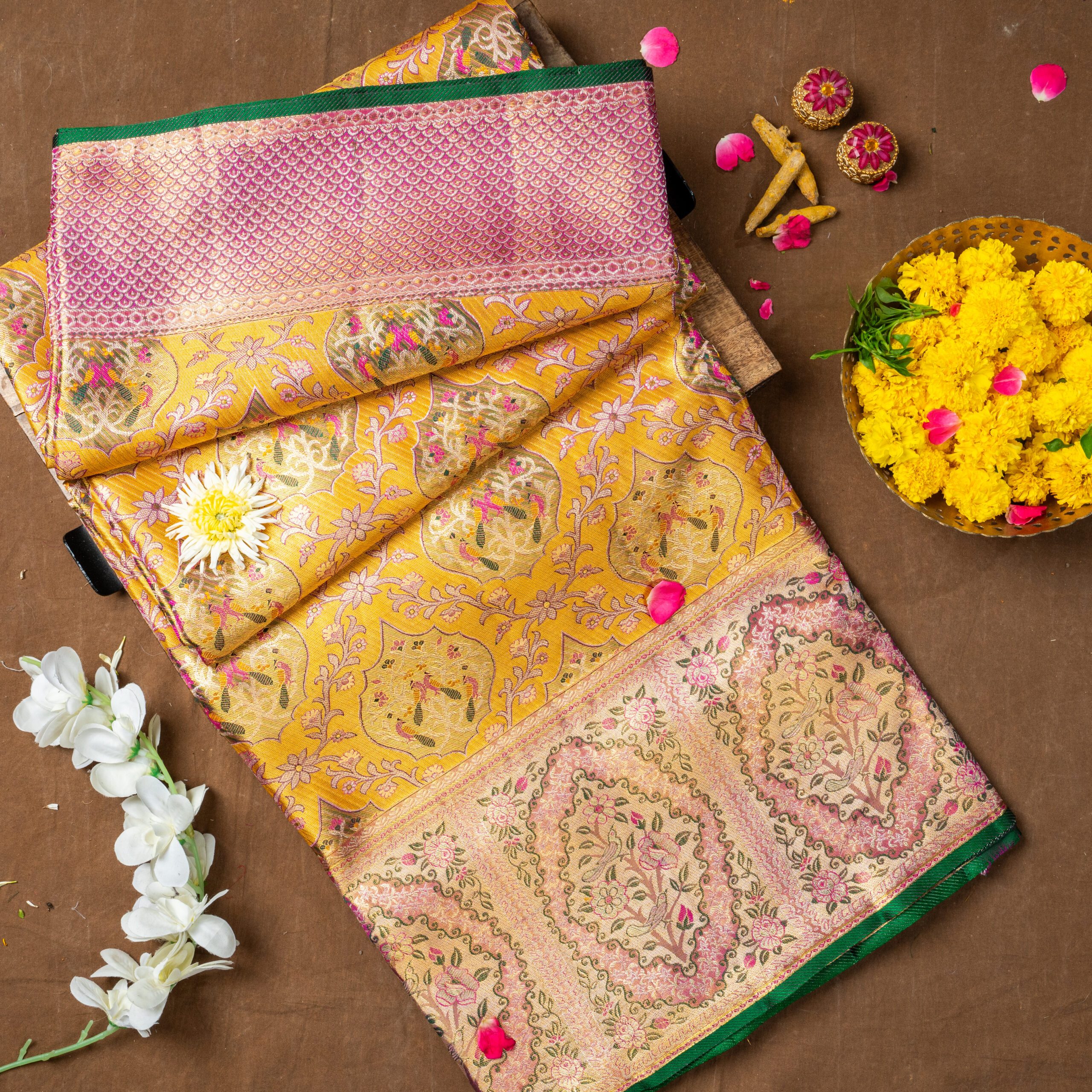 “Pure Kanchivaram Splendor: Embellished with Pure Zari, this saree narrates a regal tale of elegance, where Pure Kanchivaram threads weave a timeless masterpiece for your grand moments.”