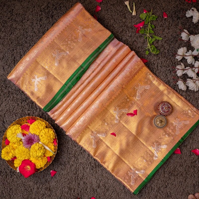“Eternal Opulence: Draped in Pure Kanchivaram, our Saree unveils resplendent beauty, adorned with 2 gm Zari. Tradition and sophistication intertwine, crafting a masterpiece that whispers timeless elegance and regal opulence for your grand moments.”