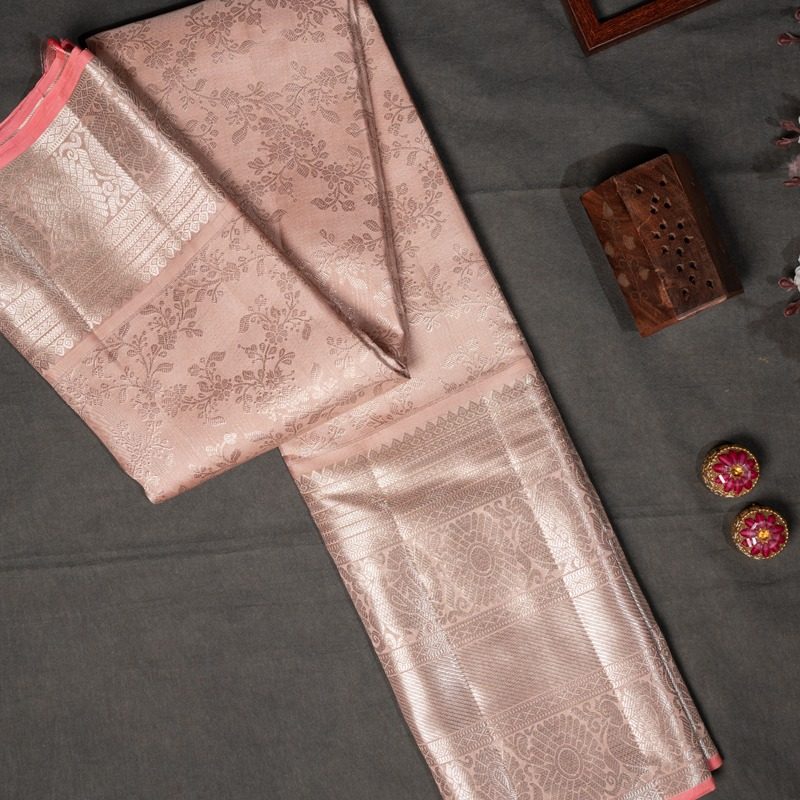 Be the first to review “Pure kanchipuram light peach & dark peach silver zari Resham Saree”