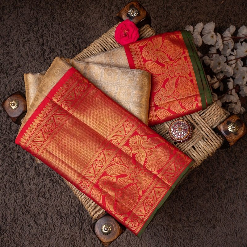 “Royal Splendor: Immerse yourself in the regal allure of our Pure Kanchivaram Saree, meticulously crafted with 1 gm Zari. This timeless masterpiece celebrates the richness of tradition, weaving elegance into every thread.”