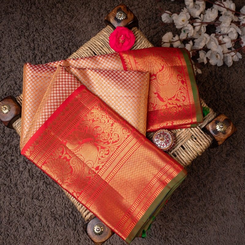 “Opulent Pure Kanchivaram Saree, adorned with 1 gm Pure Zari, epitomizes timeless elegance. Embrace tradition with a touch of regality in this exquisite silk masterpiece.”