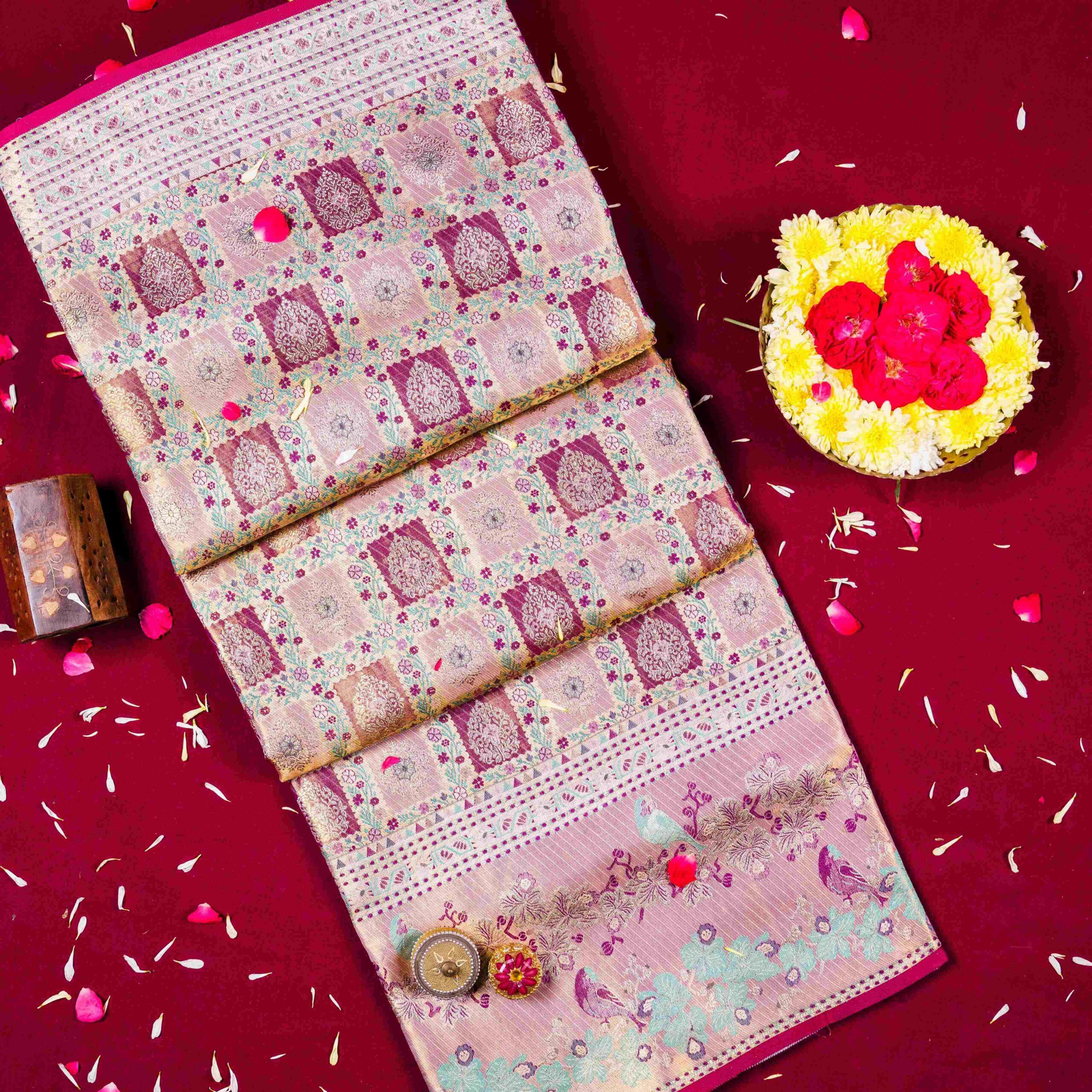 ” A luxurious Banarasi silk saree with detailed zari work, featuring elegant bird and floral motifs in gold, maroon, and pastel shades, perfect for celebrations.”