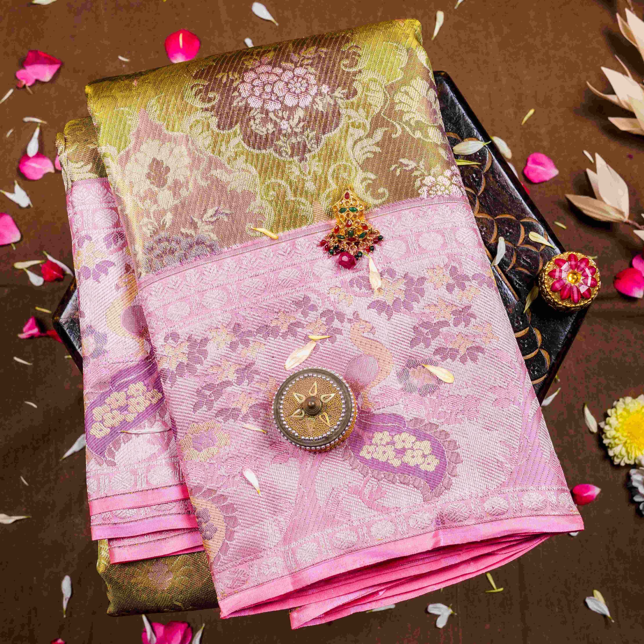 “An exquisite Kanchipuram silk saree in pink and olive green, adorned with intricate zari-woven floral and peacock motifs. Featuring a rich gold pallu and border, it’s perfect for grand occasions and celebrations.”