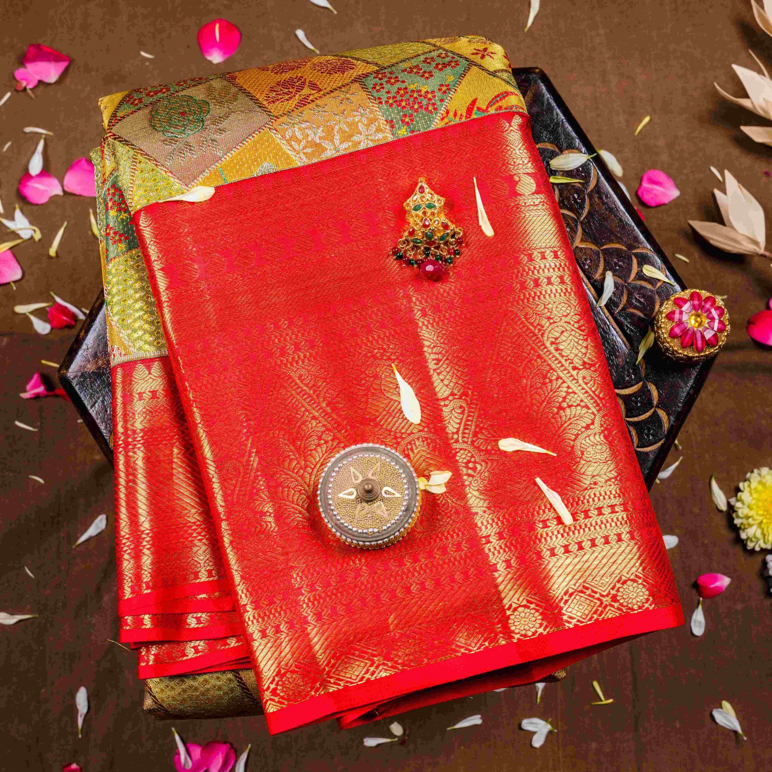 “Elegant Kanchipuram silk saree in rich red with intricate pure zari weaving. It features a multicolor and gold pallu, a silk blouse with a zari border, showcasing timeless craftsmanship and regal charm.”